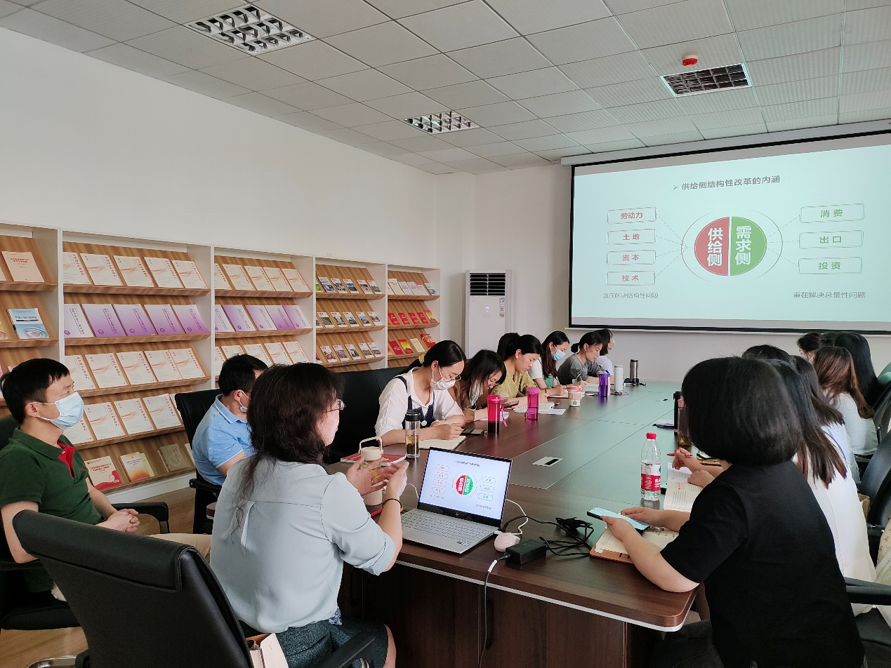 会上,陈慧女教授联系自身教学经历从三个方面作了分享。首先,陈教授强调了解构教材体系和分析学生学情的重要性。21版新教材的经济部分可以根据习近平总书记在中央经济工作会议上的相关讲话精神来理顺逻辑结构,教师也可通过学前问卷等方式了解学生的学情基础,让自己的授课设计更富有针对性。其次,在教学设计环节,陈教授以新时代中国经济从高速增长阶段转化为高质量发展阶段为导入,说明了“实现经济高质量发展”这一节的基本逻辑,即“坚持习近平经济思想”是理论指导,“深化供给侧结构性改革”是改革主线,“建设现代化经济体系”是战略目标。供给侧结构性改革是经济部分可以重点展开讲授的内容,也可以在这个部分做些师生互动的教学设计。最后,陈教授就“供给侧结构性改革的‘结构性’如何理解”和“‘现代化经济体系’在教学中如何展开”等教学中的疑难问题进行了重点梳理和讲解。在同行交流环节,“概论”教研室青年教师们进一步就教学中的困惑与陈教授进行了深入的探讨,陈教授还向教师们推鉴了“习近平系列重要讲话数据库”等备课中可使用的教学资源。