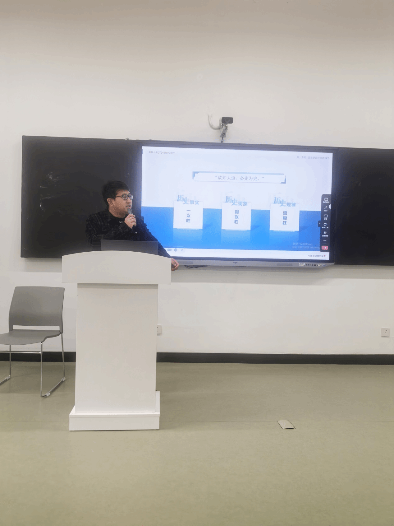上午九点,试讲活动准时开始。第一位登台的是耿成老师,他讲授的课程是《中国近现代史纲要》第一章第一节。在讲解核心知识点时,耿成老师注重知识的系统性和连贯性,通过展示图表的方式,将各个知识点串联起来,让大家一目了然。他熟练运用多媒体教学手段,展示了丰富的图片和数据,使抽象的概念变得直观形象。