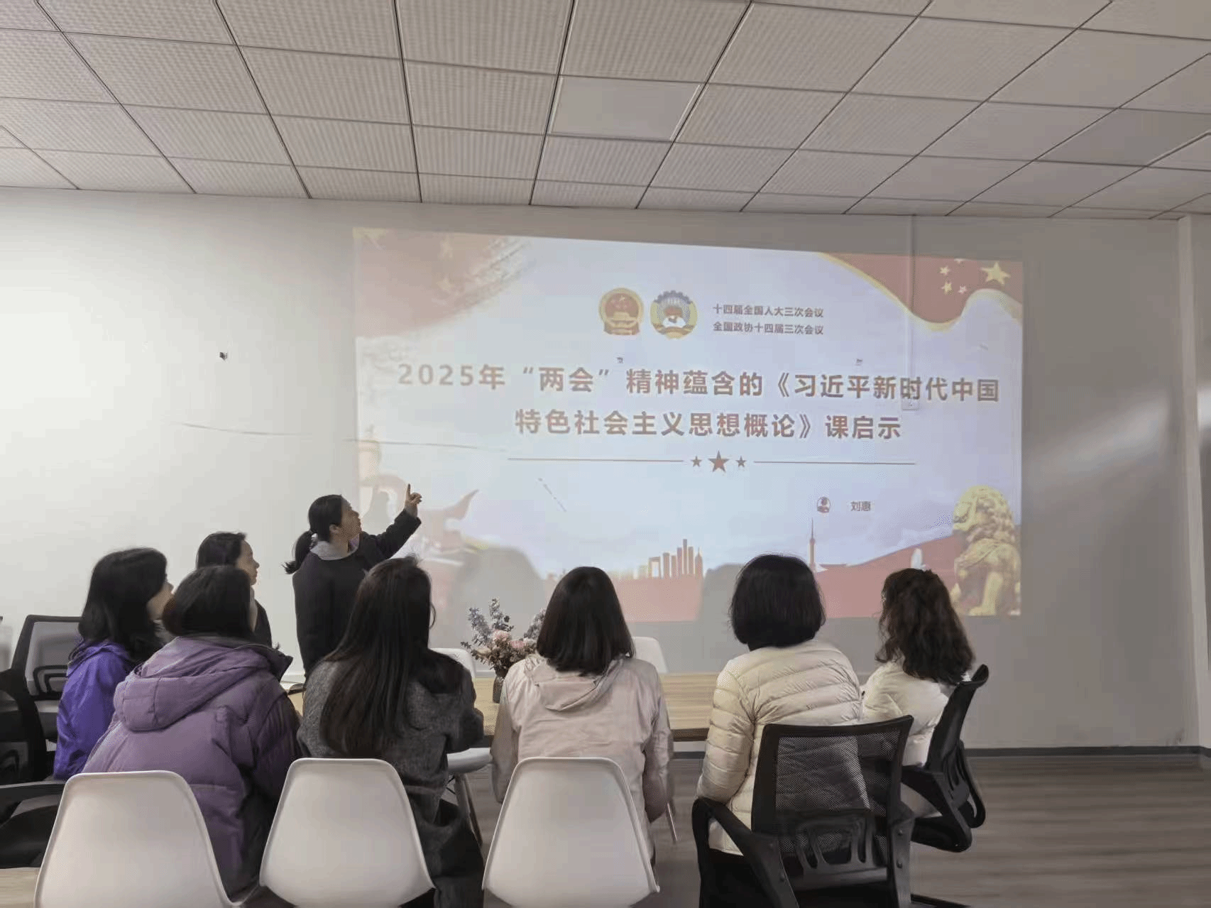 刘惠老师在会上深入解读了两会精神所蕴含的“习思想概论”课程教学科研启示,探讨了两会精神融入课程教学的有效路径。2025年是进一步全面深化改革的重要一年,两会意义重大、影响深远。《政府工作报告》锚定高质量发展,提出“因地制宜发展新质生产力”“激发数字经济创新活力”“制定实施教育强国建设三年行动计划”; 坚持以人民为中心,普惠兜底与精准施策并行,“不断增强人民群众获得感幸福感安全感”,筑牢民生安全网;绿色转型与生态治理同步,绘就低碳发展蓝图。两会精神与“习思想概论”课程教学内容具有高度的契合性,为课程教学带来了诸多启示。