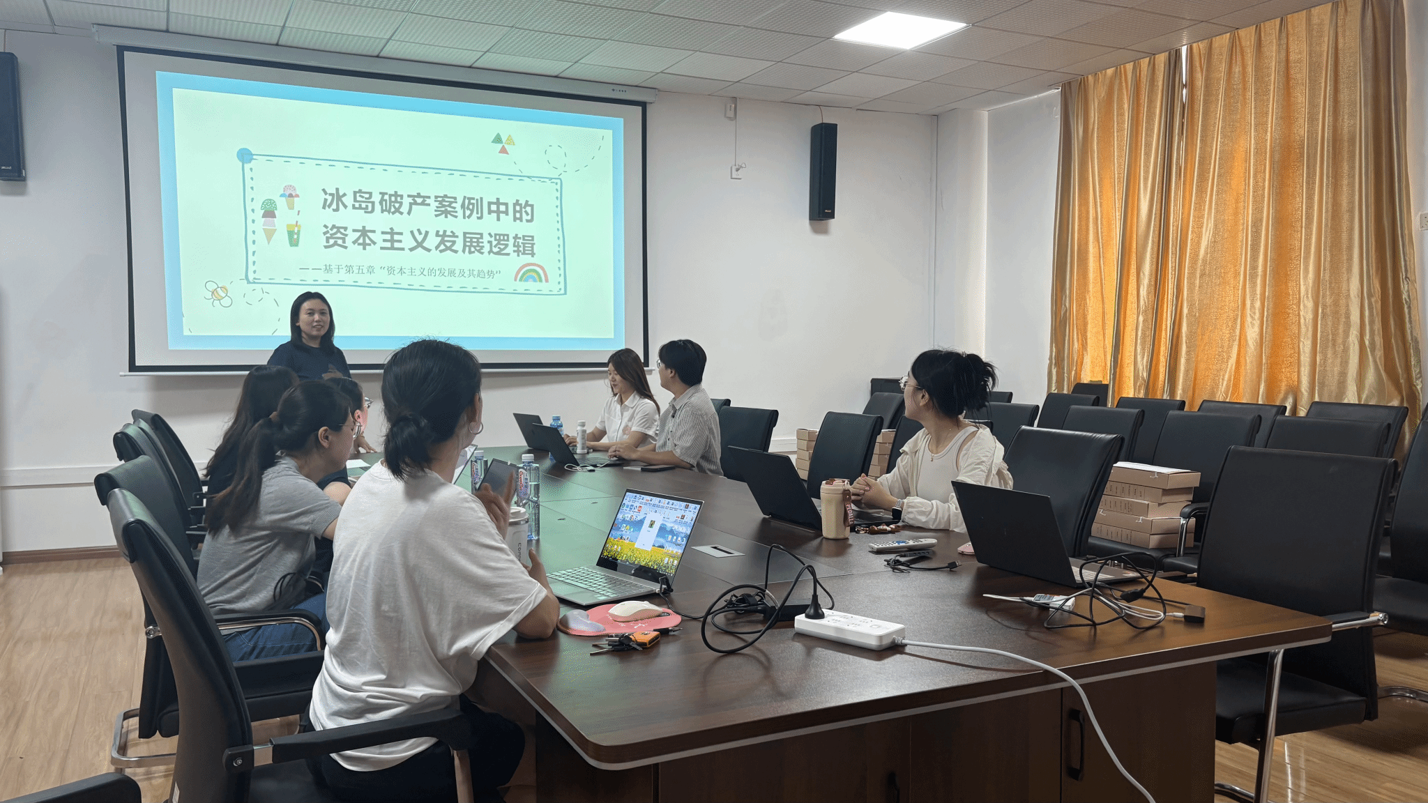 2025年7月2日上午10点,马克思主义基本原理教研室在8201会议室开展“冰岛破产案例中的资本主义发展逻辑”专题备课会。本次会议通过 “数据冲击——理论溯源——矛盾解析”的逻辑链条,结合教材核心知识点剖析当代资本主义的内在危机。会议由教研室主任田爱玲老师主持,龚萍老师作专题发言,教研室全体教师就案例教学展开热烈讨论。