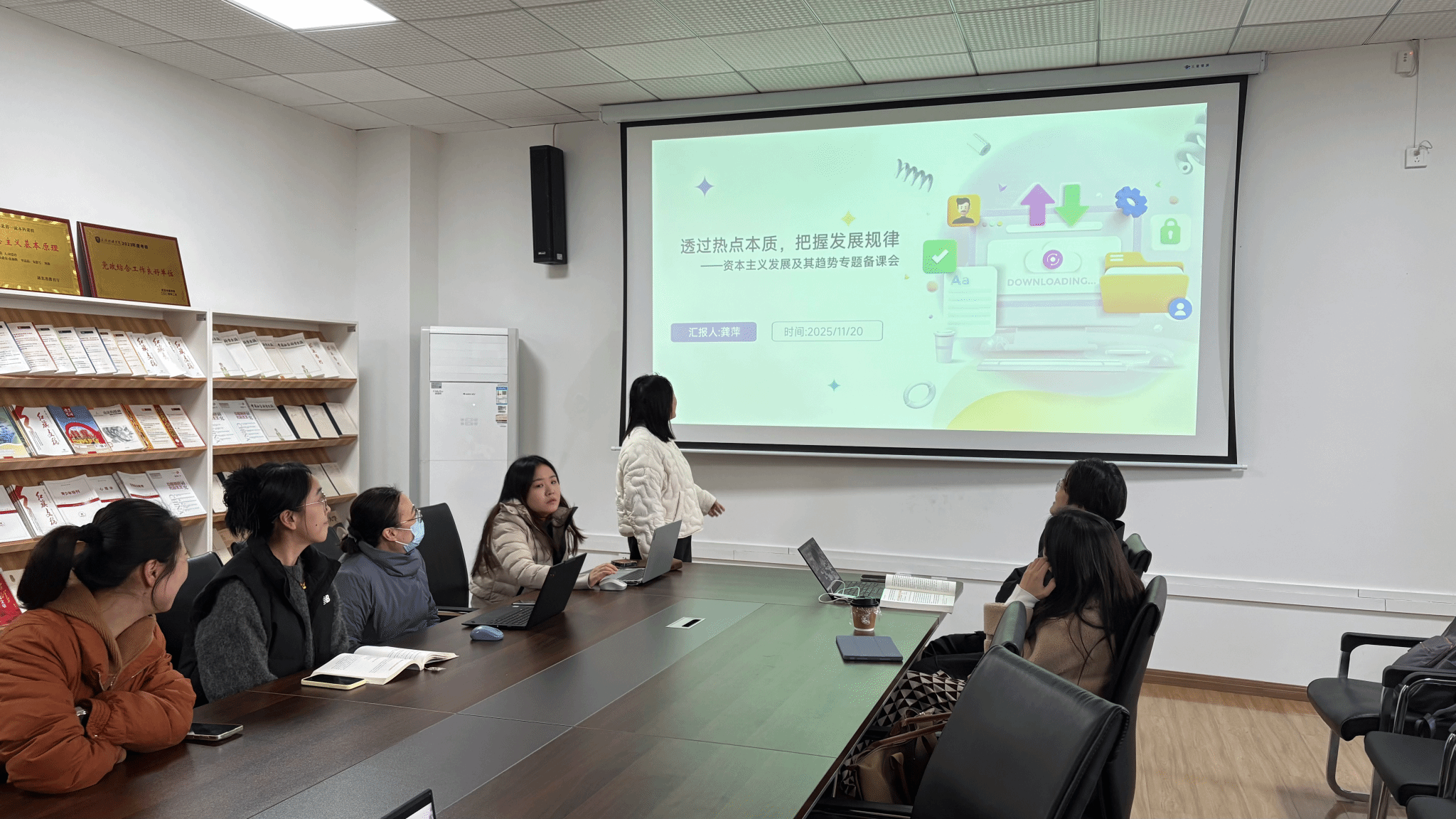 为推动思政课教学创新发展,精准把握全球经济政治发展新动态,进一步提升《马克思主义基本原理》课程教学质量,11月20日中午12点,原理教研室于8202会议室召开“资本主义发展及其趋势”专题备课会。会议由龚萍老师主持主讲,教研室全体教师参会。