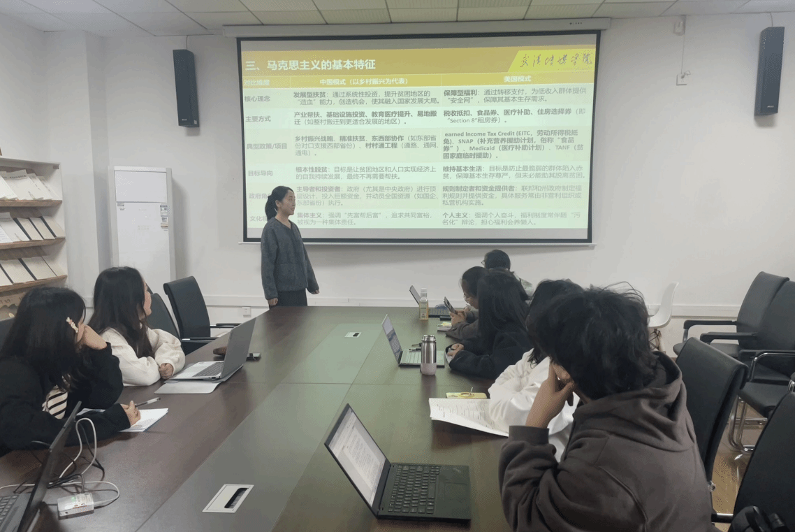 会上,钱依婷教师首先围绕课程专题一进行系统说课,详细阐释专题教学目标、核心内容、逻辑结构与教学方法,结合教学大纲中的课程重难点补充新的教学案例。在案例分享过程中,钱老师分享《马克思,请回答》一书,将马克思主义原理与现实问题结合,为课堂注入理论温度与时代活力。