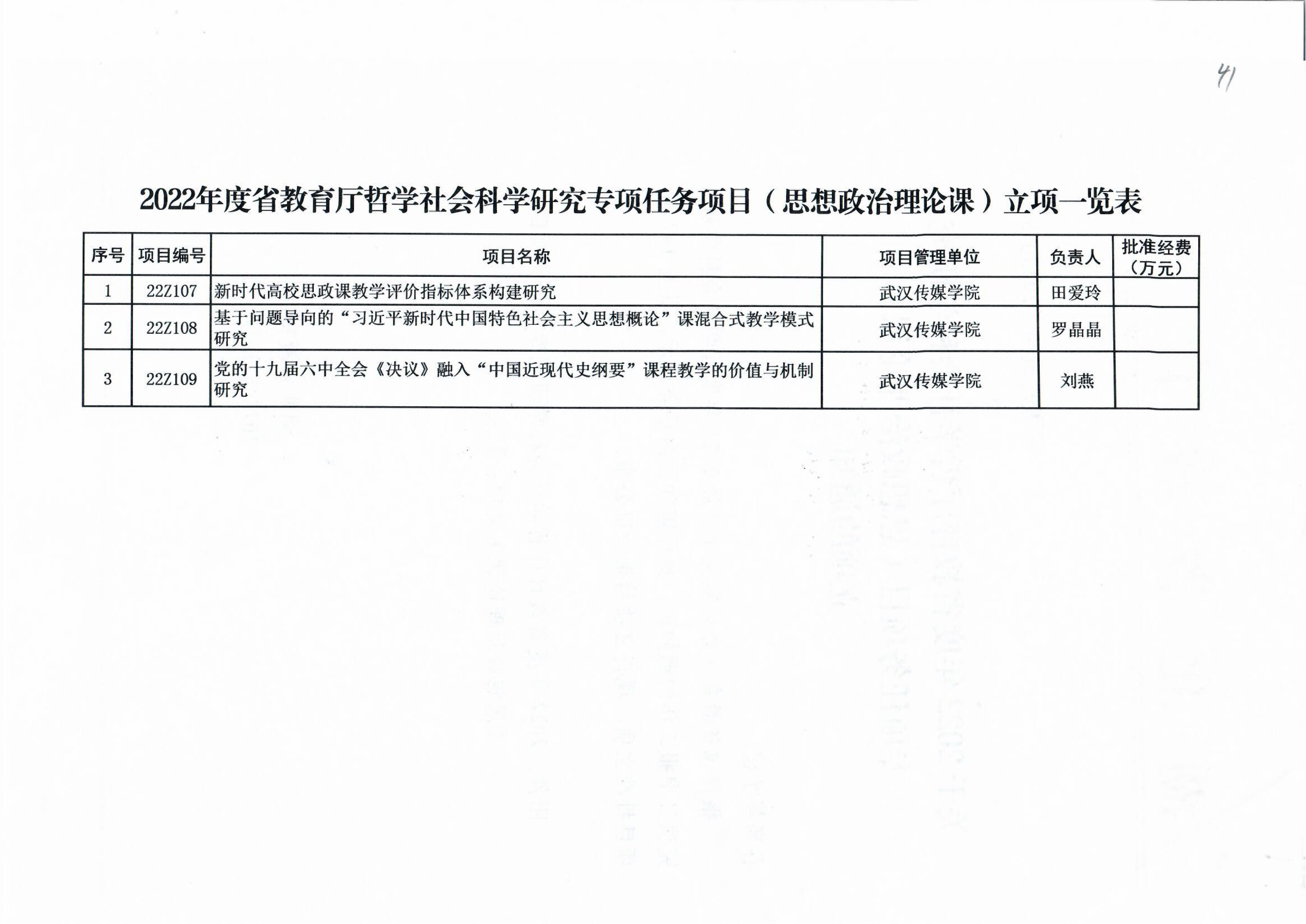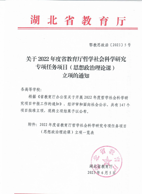 近日,湖北省教育厅公布了《关于2022年度省教育厅哲学社会科学研究专项任务项目(思想政治理论课)立项通知》(鄂教思政函〔2023〕5号),我院罗晶晶、田爱玲、刘燕三位老师的课题获批立项。