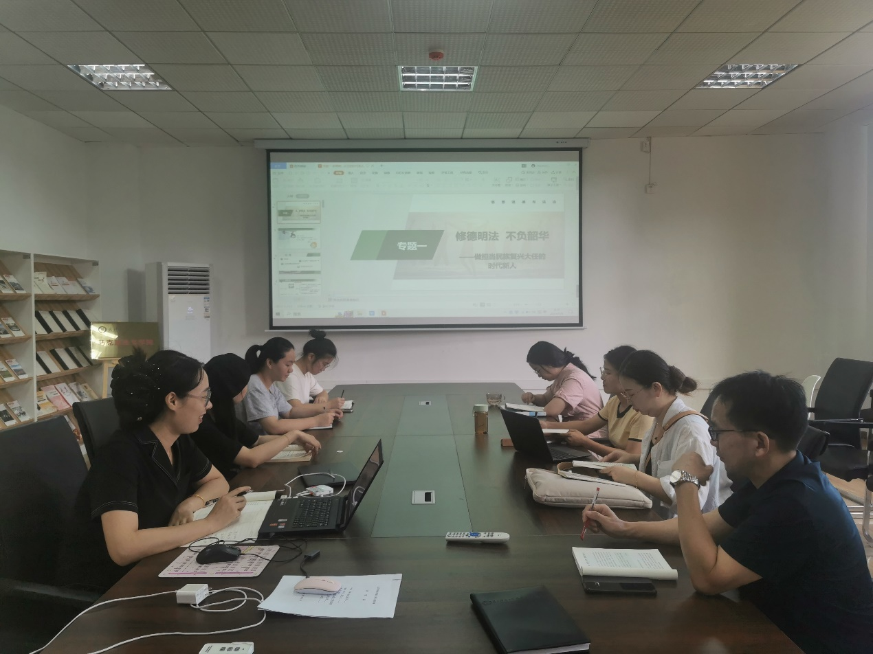 为提升“思想道德与法治”课程教学质量和教学效果,上好开学第一课,2023年9月8日上午 9:00,德法课教研室在8201会议室召开了本学期第一次线下集体备课活动。本次活动主要围绕专题一《修德明法 不负韶华——做担当民族复兴大任的时代新人》的内容进行说课和探讨,会议由胡凡凡老师主持。