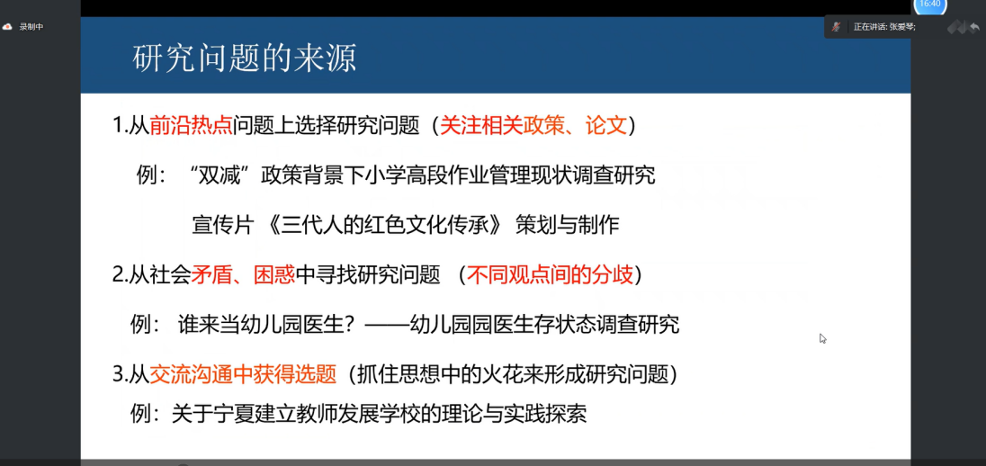 为深入贯彻落实习近平总书记关于“大思政课”的重要指示批示,落实教育部等十部门关于印发《全面推进“大思政课”建设的工作方案》的相关要求,William威廉英国深入推进教学改革,面向我校学生开设《思想政治理论课综合实践》课,以“开门办思政”的理念引领我校思政课实践教学创新发展,将思政小课堂与社会大课堂相连接,助力学生在调查研究、周知社会中学深悟透思政课的道理。由于这是一门全新的课程,为确保教学质量,提升假期专项调研的实效性,4月22日我院特邀请宁夏大学教育学院张爱琴教授,就如何指导学生做好社会调查、撰写研究报告,为全院青年教师进行线上专题辅导。