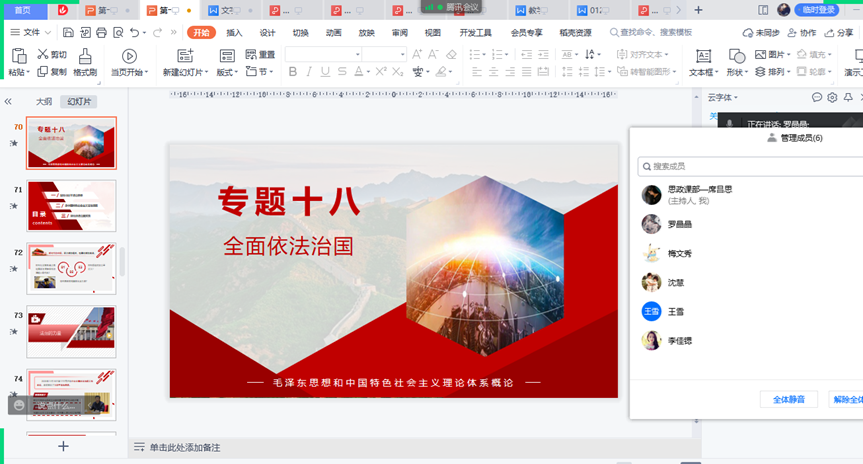 为进一步提升教学质量,提高教学水平,思想政治理论课部“概论”教研室于2022年5月11日通过腾讯会议线上召开本学期第九次集体备课会,本次会议主要围绕专题十八“全面依法治国”、专题十九“全面从严治党”、专题二十“实现中华民族伟大复兴的重要保障”的教学内容进行探讨,会议由教研室主任罗晶晶老师主持,席吕思老师主讲,教研室全体教师参加。