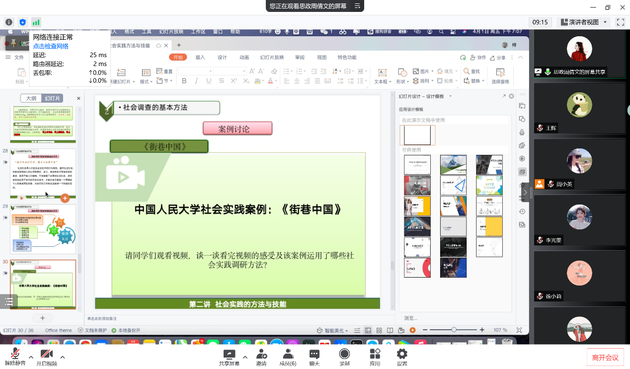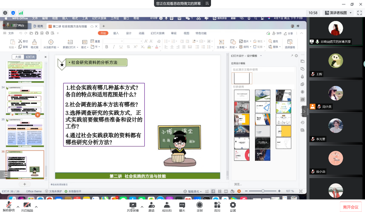 为进一步交流教学经验,提升教学效果,把思政小课堂同社会实践大课堂结合起来,引导学生在社会实践中立鸿鹄志、做奋斗者,综合实践课任课教师于2022年4月1日晚7点通过腾讯会议开展了本学期第二次集体教研活动。本次教研会主要围绕社会实践方法与技能的相关内容进行说课和讨论,由周小英老师主持,周倩文老师主讲。