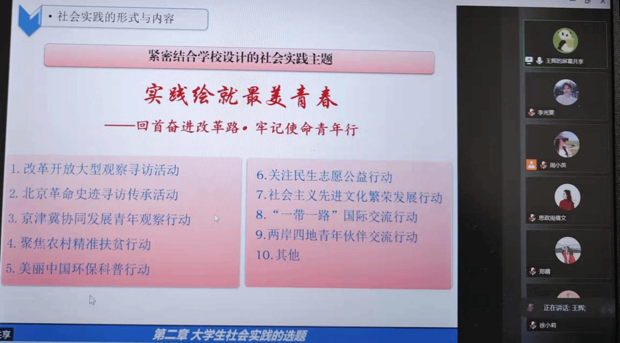 为进一步增强《思想政治理论综合实践》课堂的亲和力和针对性,引导武传学生在“大思政课”中受教育、长才干、做贡献。综合实践课任课教师于2022年3月18日晚7点在腾讯会议开展了本学期第一次集体教研活动。本次教研会主要围绕社会实践概述与选题内容进行说课和讨论,会议由周小英老师主持,王辉老师主讲。